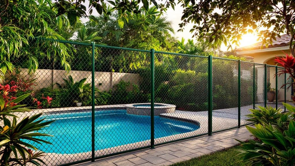 green vinyl-coated chain link fence - 4-foot pool fence installation by professional fence contractor in Miami, Florida