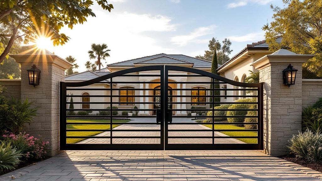 aluminum double swing driveway gate - modern horizontal bars entrance gate installation in San Diego California residential property