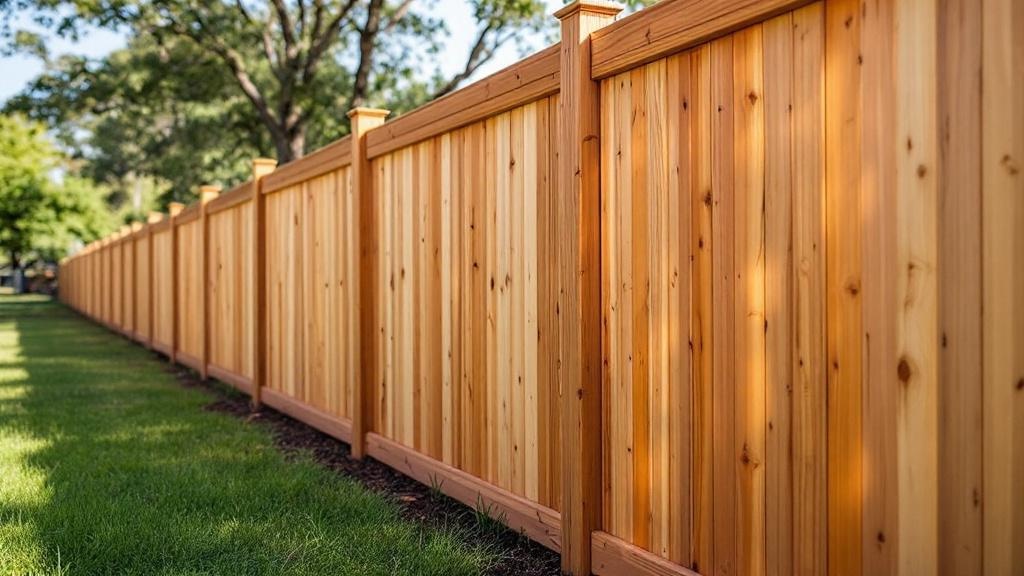 8-foot cedar shadow box privacy fence providing home security for a lakefront home. Expert craftsmanship visible in afternoon sun at this Texas property.