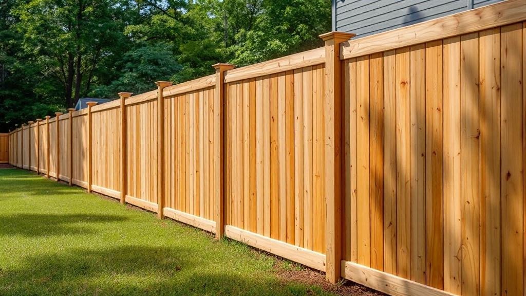 8-foot pressure-treated pine shadow box privacy fence providing child safety for a family property. Expert craftsmanship visible in ideal lighting at this Georgia property.