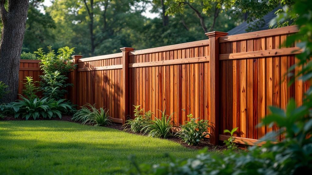 Redwood flat-top privacy fence - 6-foot redwood stained wood fence installation in Atlanta Georgia backyard