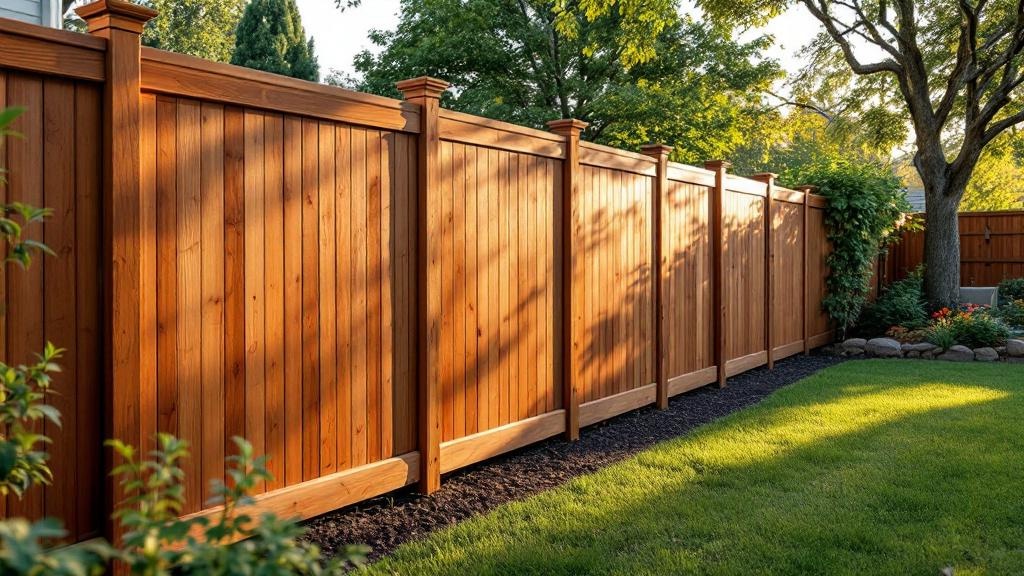 Western Red Cedar board-on-board privacy fence - 6-foot honey oak stained wood fence installation in Dallas, Texas